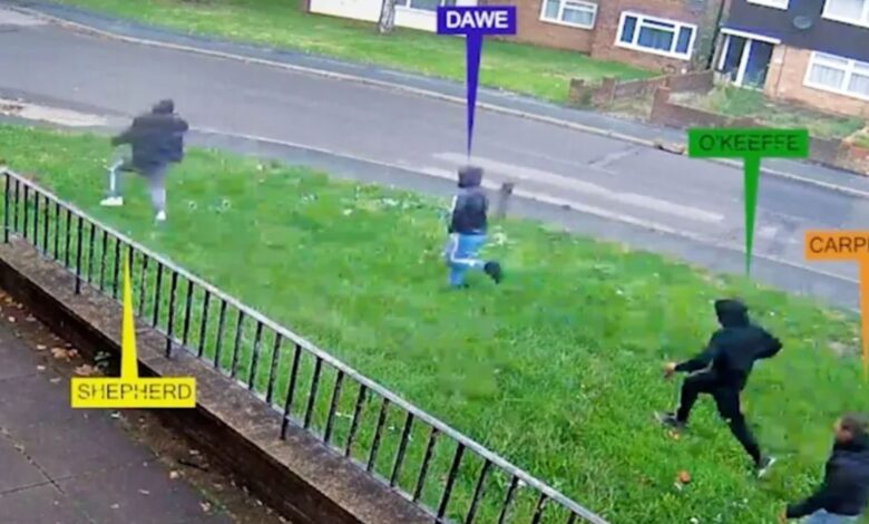 Děsivé záběry ukazují, že členové gangu Kieranovi vyhrožují, než ho pronásledujíKredit: Essex Police / SWNS