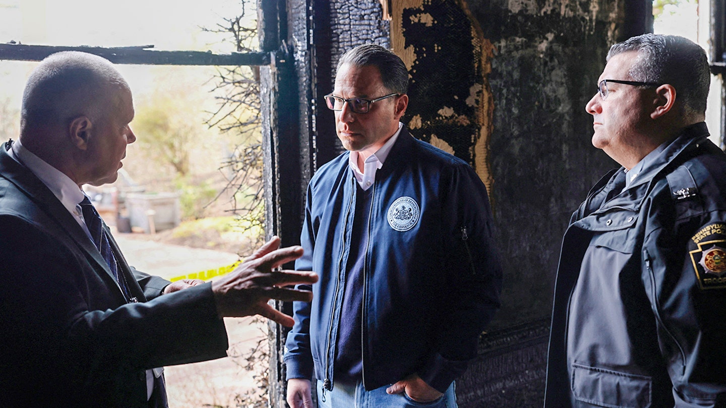 Guvernér Pensylvánie Josh Shapiro v rozhovoru před poskytnutím aktuální informace o žhářství, ke kterému došlo v sídle guvernéra v Harrisburgu v Pensylvánii 13. dubna 2025. (Služby médií Commonwealth/Handout prostřednictvím agentury REUTERS)