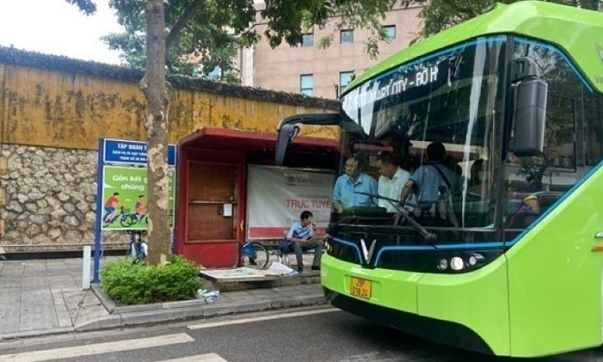Veřejný autobus dorazí na stanici v Hanoji. Foto od VNA