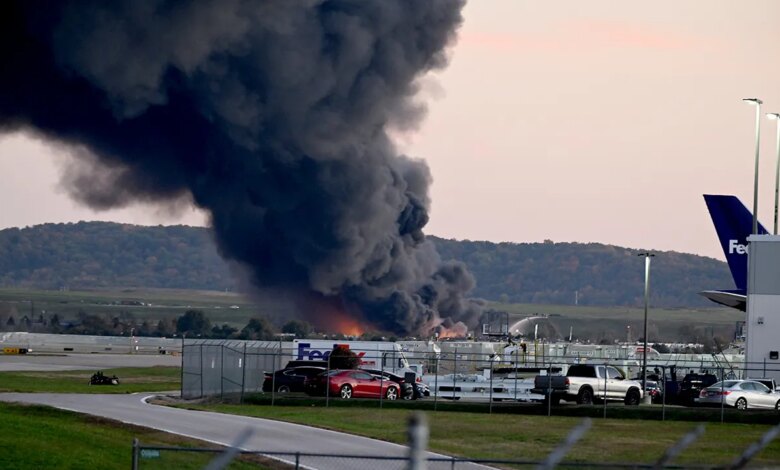 Oheň a kouř, kde se 4. listopadu zřítilo nákladní letadlo UPS poblíž mezinárodního letiště Muhammada Aliho v Louisville v Louisville, Kentucky. Plně natankované letadlo havarovalo krátce po startu s příkazem k umístění úkrytu do vzdálenosti 5 mil od letiště. (Stephen Cohen/Getty Images)