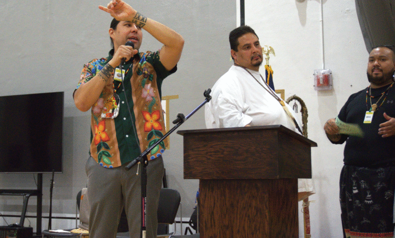 Bubenický kruh zahučel, jak se tělocvična naplnila vtipy, tancem, písněmi a vůní smažených tacos. Goldtooth, který je členem komunity Siouxů Shakopee Mdewakanton, zahájil obřady modlitbou.