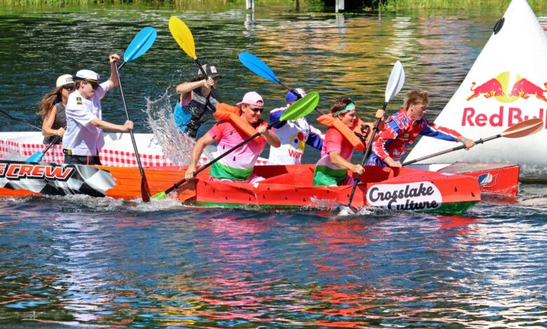 CROSPLAKE – Týmy soutěží během každoročních závodů v kartonových lodích v sobotu 9. srpna 2025 v Moonlite Bay v Crosslake.