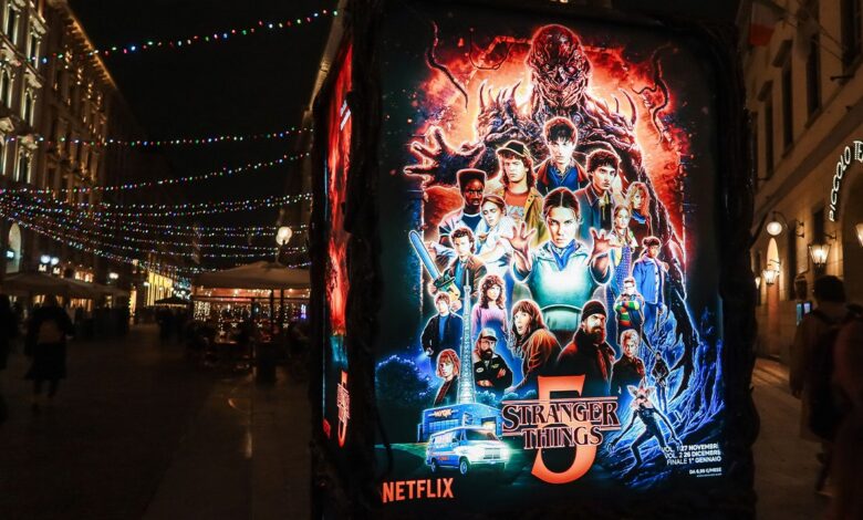 Celkový pohled na vánoční strom Netflix Stranger Things je na Via Dante v Miláně v Itálii 19. prosince. (Alessandro Bremec/NurPhoto přes Getty Images)