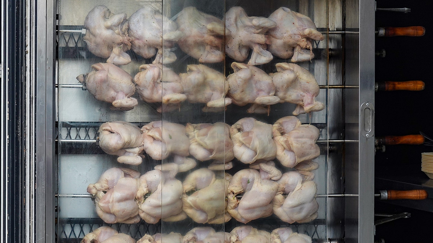 Řady syrových kuřat se 9. září 2025 umísťují na otočné rožně do skleněné grilovací pece ve stánku s občerstvením v Rotterdamu v Nizozemsku. (Michael Nguyen/NurPhoto)
