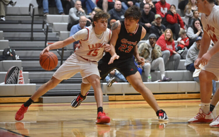 Foto štábu / Brian Yauger Angelo Melidona z LaBrae jede ke koši kolem seniora Girarda Allena Hesse-Cardonu během pátečního zápasu v Leavittsburgu. Melidona skončila s 27 body.