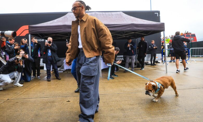 Lewis Hamilton odhaluje speciální oblečení „Ferrari“, který se připravuje na oblékání psů Roscoe na závody Silverstone a Monza F1