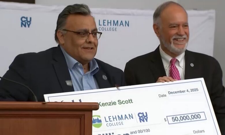 Dar od MacKenzie Scott Foundation byl oznámen ve čtvrtek ráno v Lehman College Center for the Performing Arts v Bronxu.