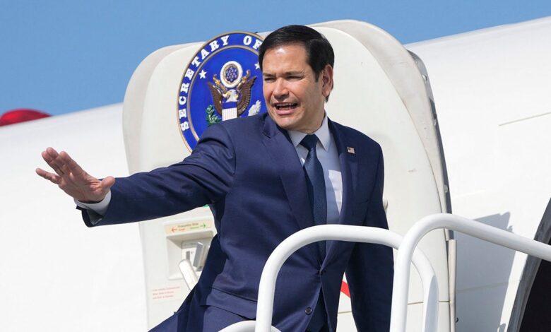 Americký ministr zahraničí Marco Rubio nastupuje 3. února 2025 na mezinárodním letišti Panama Pacifico v Panama City do letadla na cestě do Salvadoru. Rubio je v Panamě na dvoudenní oficiální návštěvě. (Mark Schiefelbein/Pool/AFP přes Getty Images)