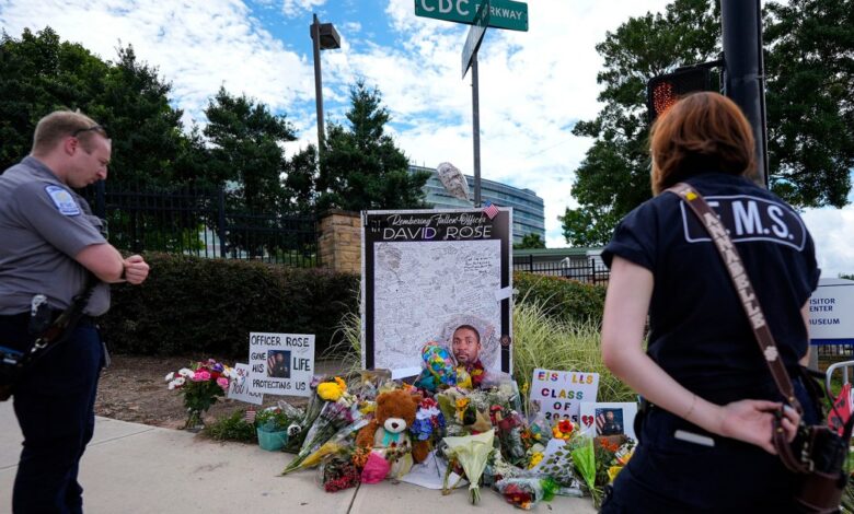 Památník po střelbě poblíž CDC, kde byl policejní důstojník okresu DeKalb David Rose zabit, když reagoval, ve středu 13. srpna 2025 v Atlantě. AP Photo/Mike Stewart
