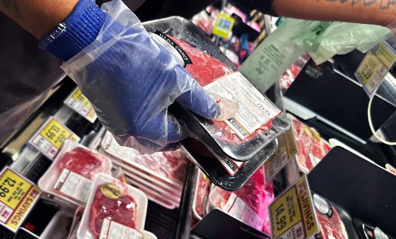 Pracovník skladuje filety z hovězí svíčkové v sekci masa v obchodě s potravinami ve Washingtonu, 25. října 2025. (Tom Williams/CQ-Roll Call, Inc prostřednictvím Getty Images)