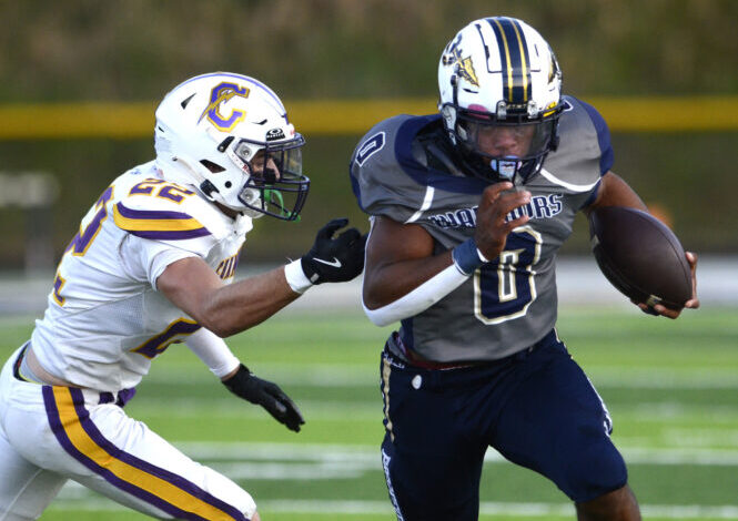Zaměstnanci Photo / R. Michael Semple Brookfield běží zpět Rico Smith (0) bojuje s náčiním od Champiova Quin McDermotta během první poloviny hry A v Brookfieldu 12. září.