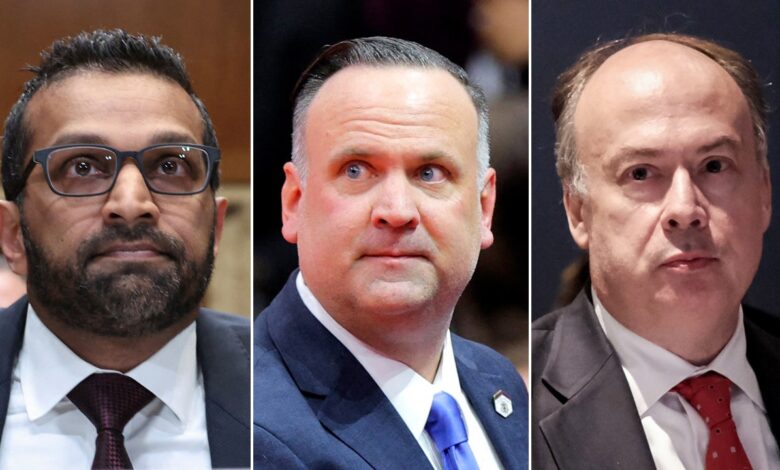Zleva doprava, ředitel FBI Kash Patel, Dan Scavino a Jeff Clark. (Reuters/Kevin Lamarque/Brian Snyder;)