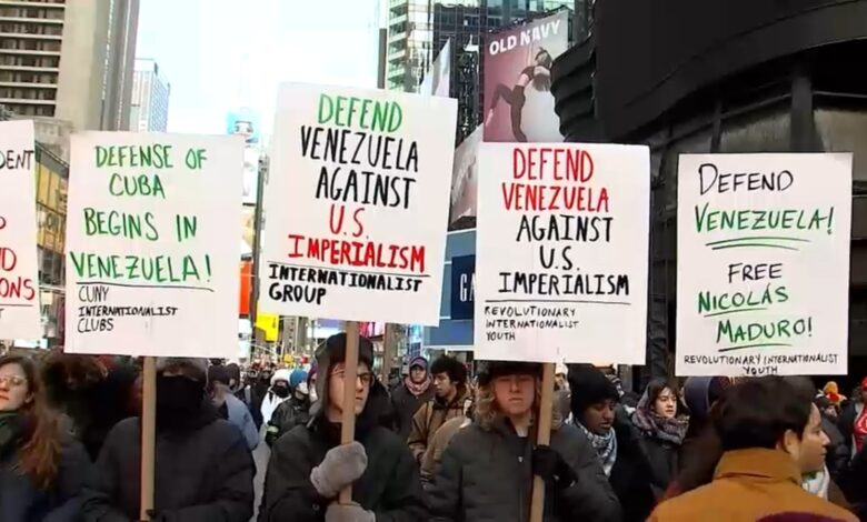 Skupina lidí demonstrovala v sobotu odpoledne na Times Square proti americké intervenci v Caracasu.