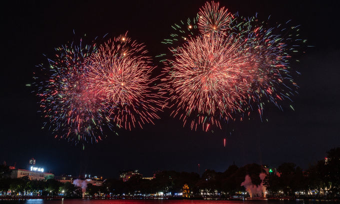 Ohňostroje osvětlují Hanoi a Ho Či Minovo městské obloze, aby označily 80. národní den Vietnamu Vietnam