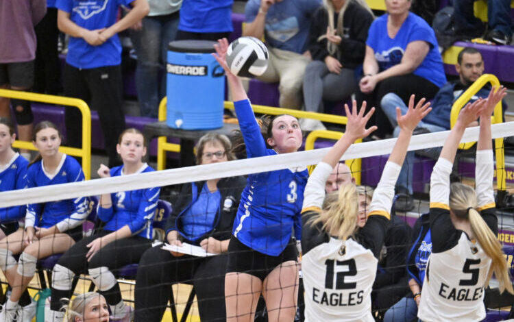 Foto štábu / Brian Yauger Peyton Ford z Jackson-Milton odpaluje míč přes síť během prvního setu čtvrtečního regionálního semifinálového zápasu proti Monroeville v Burtonu.