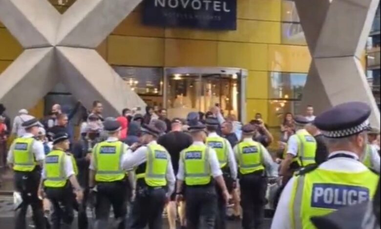 Met policejní obklopuje hotel Canary Wharf, protože protestující tvrdí, že tam jsou uchazeči o azyl