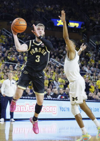 Strážce Purdue Braden Smith (3) prošel kolem michiganského strážce Nimari Burnett (4) za střelu během prvního poločasu univerzitního basketbalového zápasu NCAA úterý 11. února 2025 v Ann Arbor, Michigan (AP Photo/Duane Burleson)