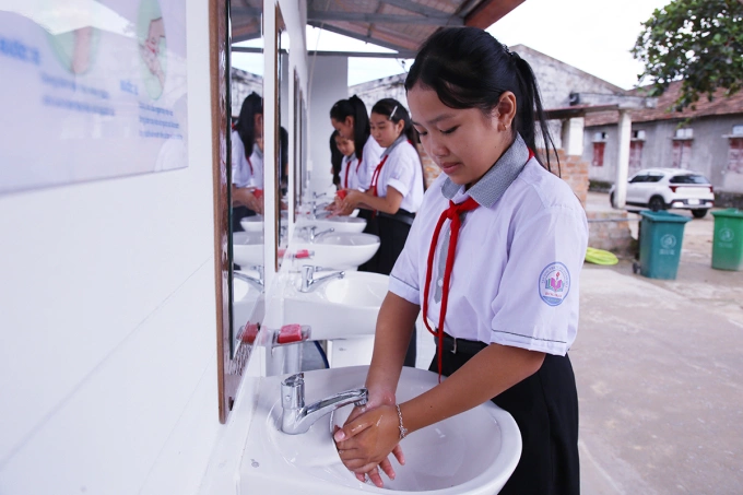 Studenti střední školy Hung Trach č. 2 v Quang Tri si umývají ruce na nové toaletě. Foto: Dac Thanh |