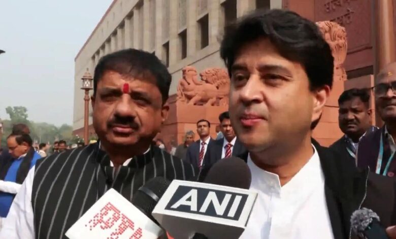 Ministr Unie Jyotiraditya M. Scindia (vpravo) hovoří před parlamentem 2. listopadu 2025. Obrázek: Snímek obrazovky z videa zveřejněného na X/@ANI