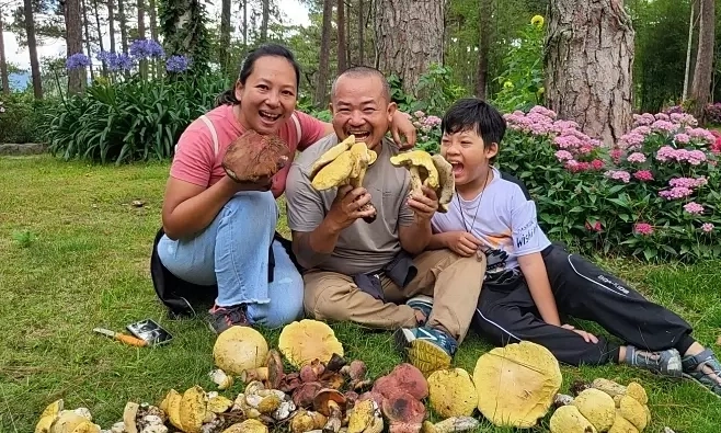 Huynh Dung (C), jeho manželka a jeho syn Minh Nhat (R) zažívají shánění hub v Da Lat, květen 2025. Foto s laskavým svolením Dung |