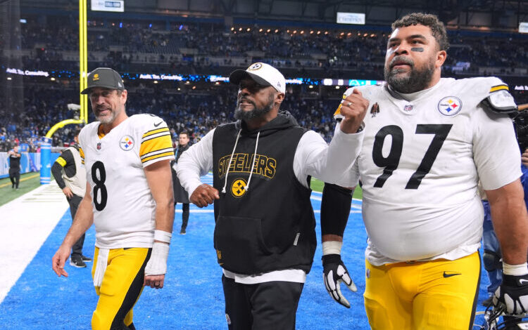 Aaron Rodgers z Pittsburgh Steelers, zleva, Mike Tomlin a Cameron Heyward odcházejí ze hřiště poté, co Pittsburgh vyhrál fotbalový zápas NFL proti Detroit Lions, neděle 21. prosince 2025 v Detroitu. (AP Photo/Ryan Sun)
