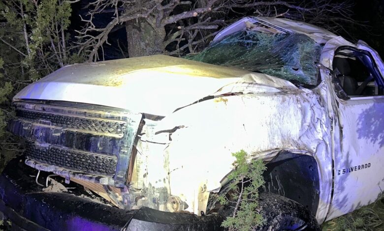 Bílý Chevrolet Silverado, ohlásil ukradený dříve z policejního oddělení Flagstaff, otočil se na zábradlí, než několikrát převrátil a narazil do stromu.