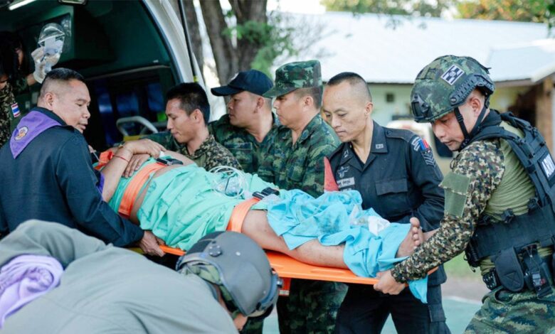 Na této fotografii zveřejněné královskou thajskou armádou je zraněný thajský voják převezen k převozu do nemocnice v provincii Sisaket v Thajsku v neděli 7. prosince 2025 poté, co podle mluvčího thajské armády kambodžští vojáci vystřelili na thajské území. (Královská thajská armáda přes AP)
