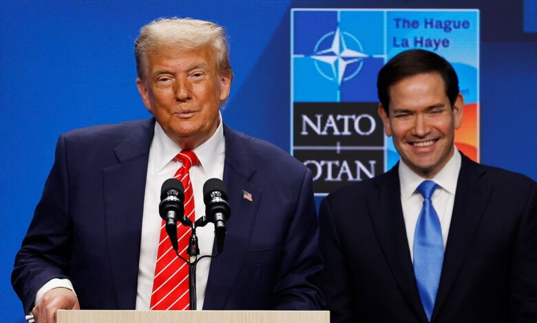 Prezident Donald Trump spolu s ministrem zahraničí Marcem Rubiem hovoří během tiskové konference po summitu NATO 25. června 2025 v nizozemském Haagu. Na programu summitu byl nový plán investic do obrany, který zvýšil cíl výdajů na obranu na 5 % HDP. (Omar Havana/Getty Images)