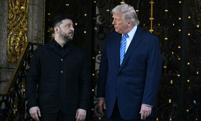 Prezident Donald Trump vítá 28. prosince 2025 ukrajinského prezidenta Volodymyra Zelenského v jeho rezidenci Mar-a-Lago v Palm Beach na Floridě. (Jim WATSON / AFP přes Getty Images)