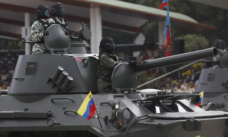 Vojáci venezuelské armády pochodují s vojenskými vozidly během přehlídky v rámci oslav Dne nezávislosti na Fuerte Tiuna ve venezuelském Caracasu 5. července 2023. (Pedro Rances Mattey/Anadolu Agency prostřednictvím Getty Images)