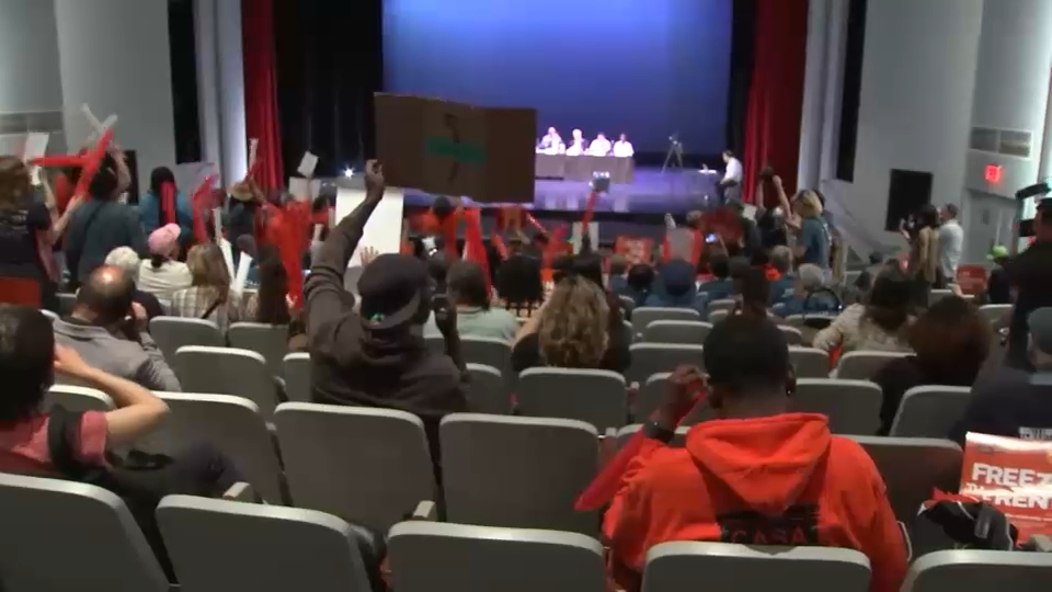 Před hlasováním se nájemníci shromáždili mimo Laguardia Community College v Queensu, kde se konalo setkání.