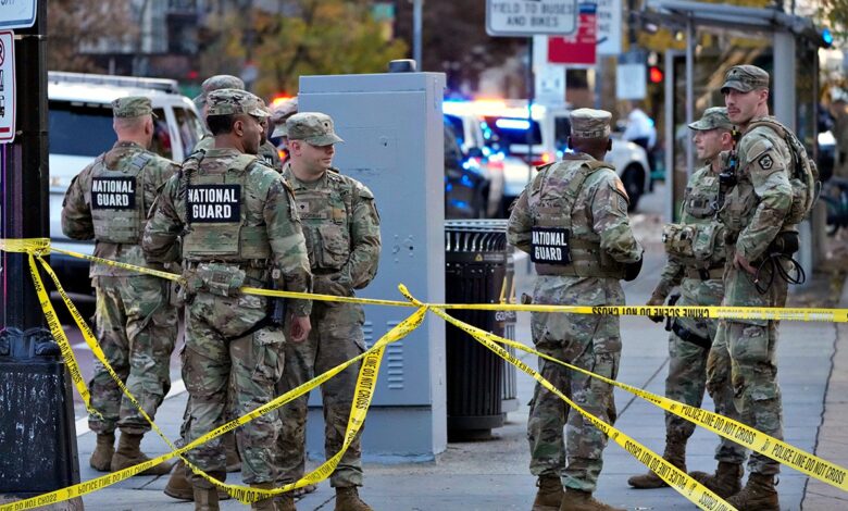 Členové Národní gardy se shromáždili poté, co se ve středu 26. listopadu 2025 poblíž Bílého domu ve Washingtonu zastřelili dva vojáci Národní gardy. (AP Photo/Mark Schiefelbein)