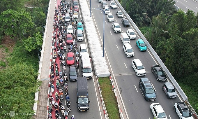 Motocykly se ráno 6. ledna 2026 tlačí v pruhu s prioritou pro cyklisty (označeném červeně) na bulváru Mai Chi Tho. Foto VnExpress/Dinh Van