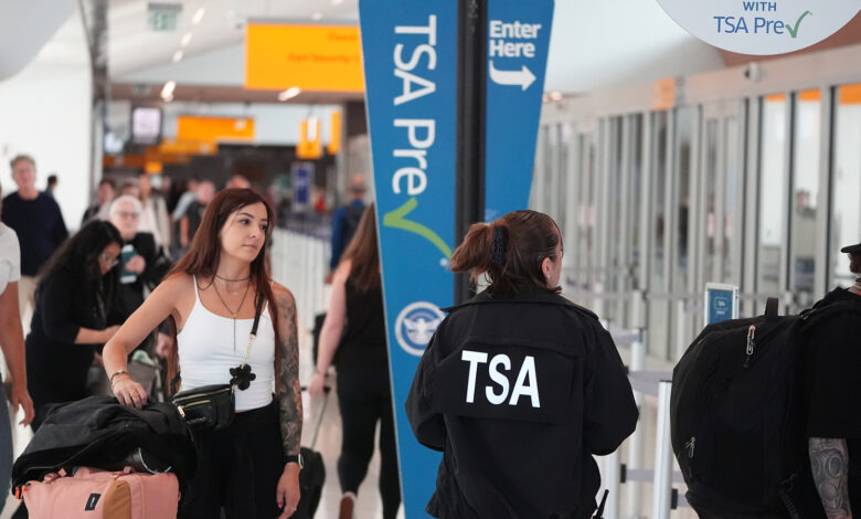 Pracovní pracovník pro správu bezpečnosti dopravy vede cestovatele na bezpečnostním kontrolním stanovišti na mezinárodním letišti v Denveru ve čtvrtek 2. října 2025 v Denveru.