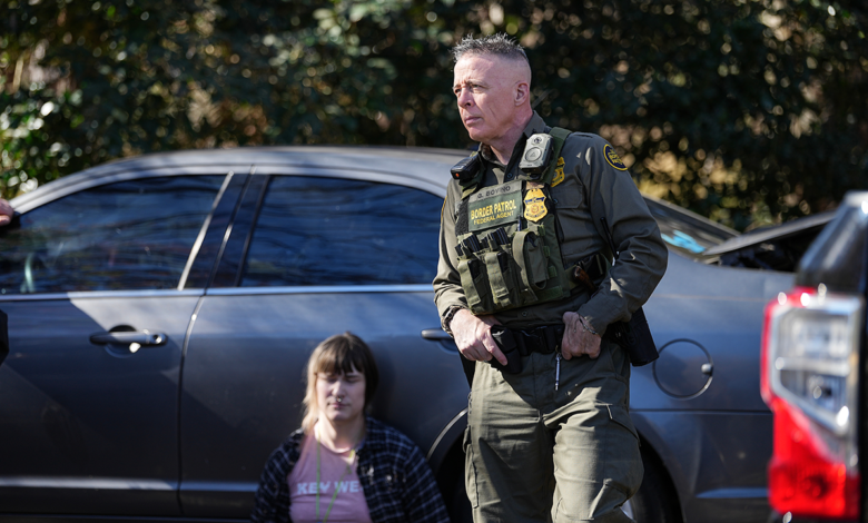 Velitel americké pohraniční stráže na svobodě Gregory Bovino, vpravo, přihlíží zadržovanému sedícímu u auta, pondělí 17. listopadu 2025 v Charlotte v Severní Karolíně. (AP)