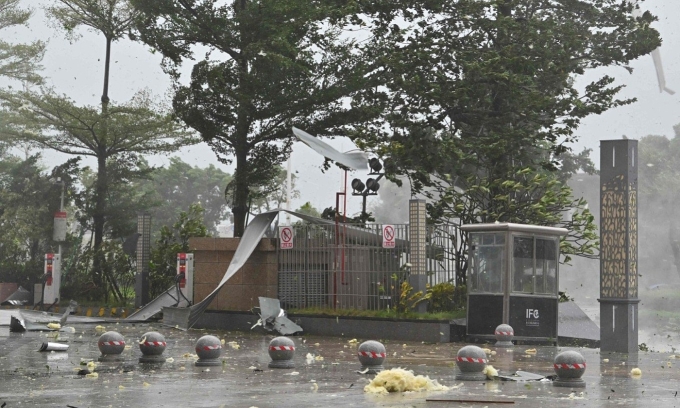 Železná listy jsou odfouknuty větrem na ulicích Yangjiang, Guangdong, protože Typhoon Ragasa dělá landfall v Číně 24. září 2025. Foto: AFP |