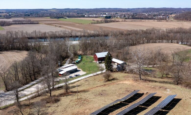 Solární panely nainstalované jako součást programu venkovské energie pro Ameriku v pivovaru Wooly Pig Farm Brewery ve Fresnu v Ohiu.Jim West/UCG/Universal Images Group/Getty
