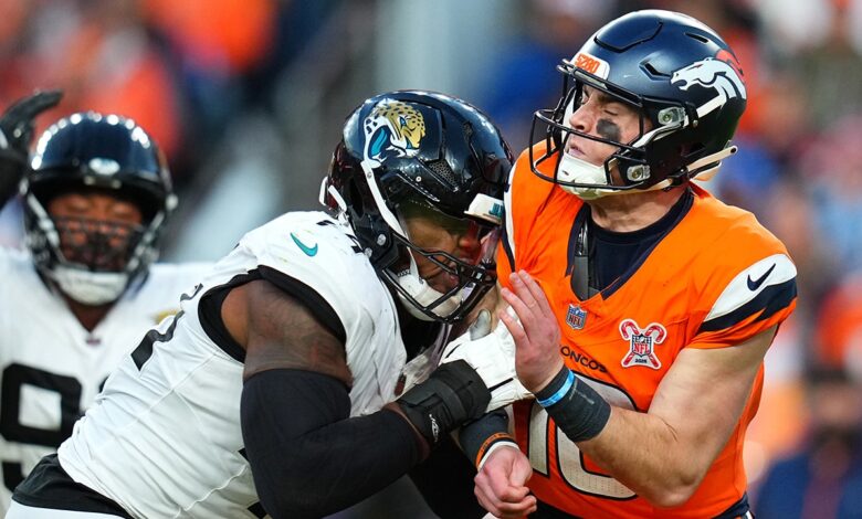 Obranná část Jacksonville Jaguars Travon Walker, vpředu vlevo, se potýká s rozehrávačem Denver Broncos Bo Nixem, vpravo, během druhé poloviny fotbalového zápasu NFL v Denveru, neděle 21. prosince 2025. (AP Photo/Jack Dempsey)